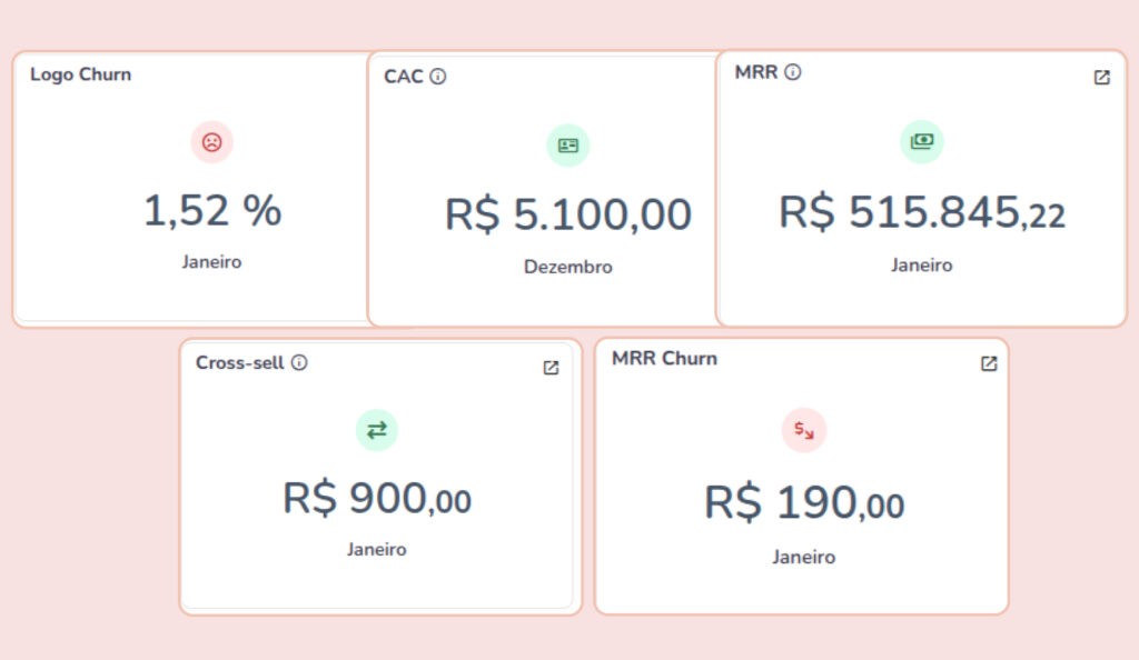 Nosso painel de métricas traz indicadores vitais para a gestão de um negócio recorrente, como MRR, churn, CAC e LTV. É possível configurar o que você quer ver na dashboard e ter acesso a mais de 30 relatórios gerenciais que te permitem ter o seu negócio nas mãos e o melhor processo para tomada de decisão